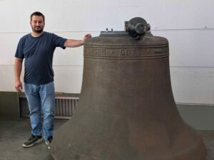 Die Glocke stammt aus dem früheren Geläut der Kirche, das im Jahr 2018 durch neue Bronzeglocken ersetzt wurde. Gestaltet wurden diese vom Glockenkünstler und Ruhestandspfarrer Günter Niekel. Bereits damals durften wir den Transport der Glocken begleiten und unterstützen.
