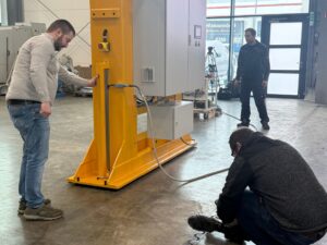 Bevor sie das Werk verlässt, wird sie für den Kunden im Rahmen der technischen Abnahme umfassend dokumentiert. Gemeinsam mit einem Experten für Videografie entsteht eine vollständige Videodokumentation, in der sämtliche relevanten Funktionen und Abläufe festgehalten werden. Dazu gehören zentrale Funktionen, Bewegungsabläufe, Steuerungssysteme sowie sicherheitsrelevante Prozesse. Zusätzlich werden wichtige Maße und technische Details für die Abnahme dokumentiert.